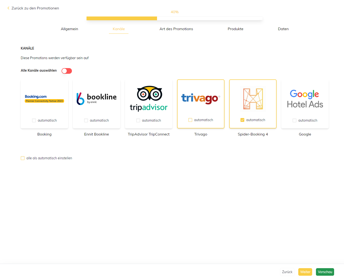 Spider-Booking 4 ist umrahmt und zusätzlich ist das Häkchen bei "automatisch" gesetzt, was bedeutet, die Promotion ist hier aktiv und wird automatisch für jeden Gast angewendet, der Code muss nicht manuell eigentragen werden.