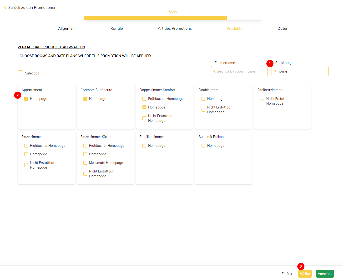 Hier geben Sie an, auf welche Zimmer und Raten die neue Promotion gelten soll: