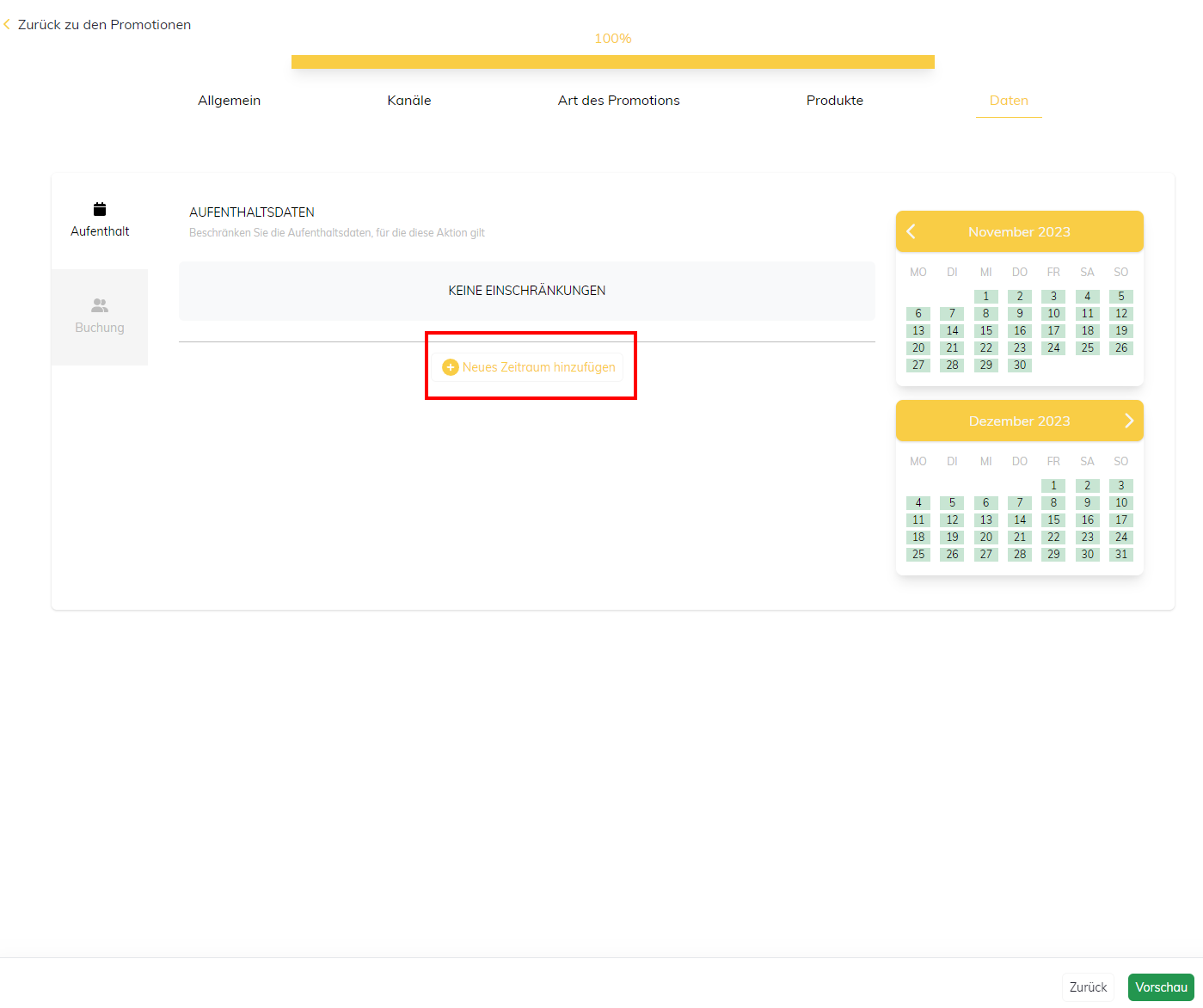 Sollte Ihre PROMOTION nur für einen bestimmten Zeitraum gelten, haben Sie im nächsten Menüpunkt die Möglichkeit diese Einschränkung festzulegen.