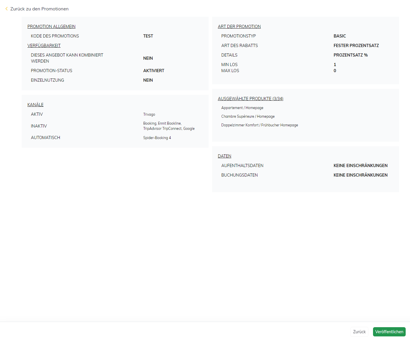 Wenn alles korrekt ist, können Sie den VERÖFFENTLICHEN Button klicken, nach wenigen Sekunden wird diese Promotion online aktiv sein.