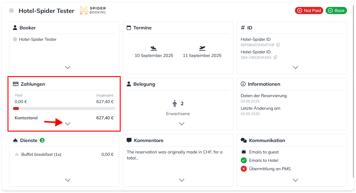In der Detailansicht klicken Sie auf den Pfeil im Feld "Zahlungen":