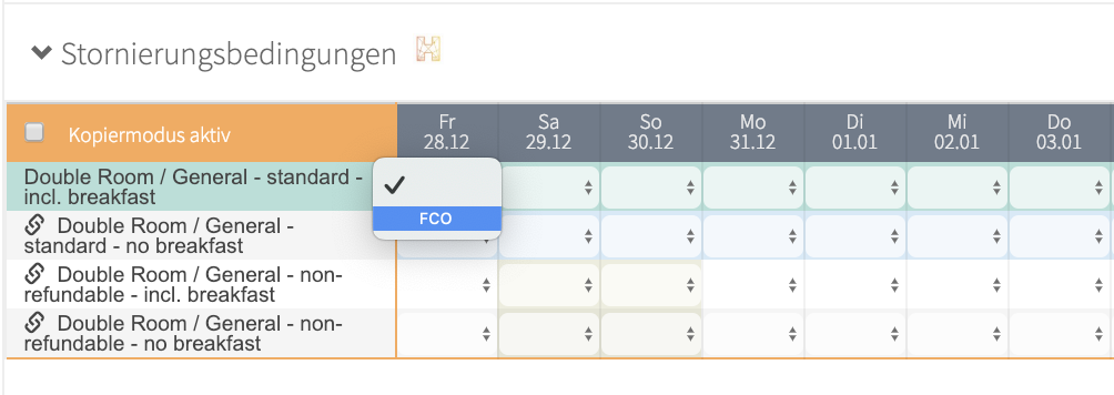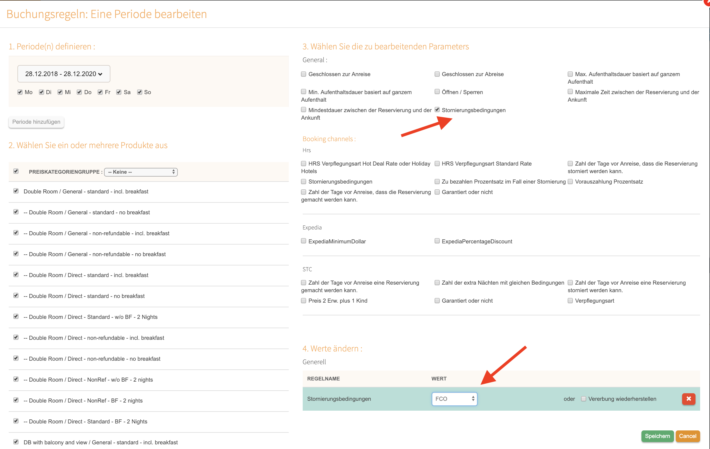 Die Stornierungsbedingungen müssen in 2 Schritten für die Buchungsmaske definiert werden.