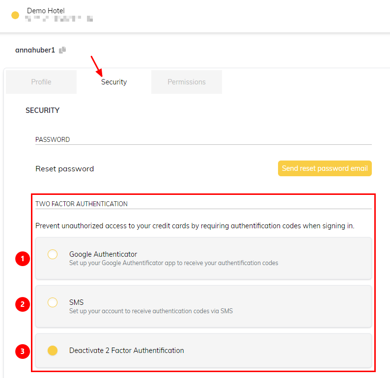 Use this status to disable two-factor authentication for your user account. Afterwards, you will no longer have access to credit card data in the reservations.