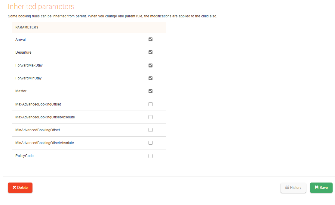 Inheritance of booking rules ("parameters") can be between rooms, rates and products.